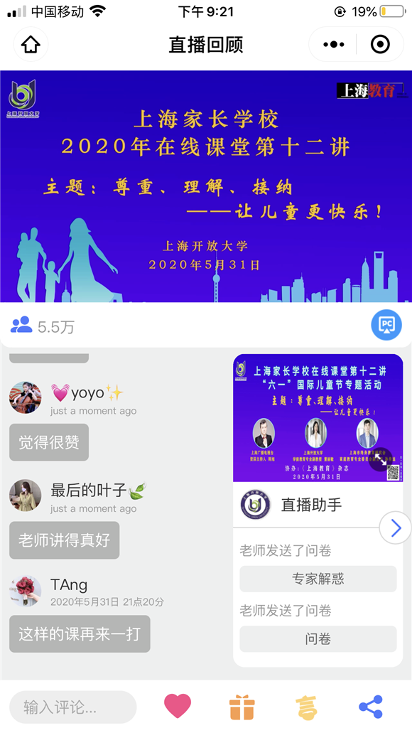 面对5.5万人次的在线收看家长,在线课堂的上海广播电视台主持人韩旭一连说了5个“不要期望”来共勉:不要期望孩子对我们俯首帖耳,但愿他们尊重我们;不要期望孩子获得多大的成就,但愿他们善于学习;不要期望孩子一定获得成功,但愿他们度过有意义的人生;不要期望孩子做我们的傀儡,但愿他们成为我们的精神伙伴;不要期望孩子不遭遇任何失败,但愿他们有勇气从头再来。