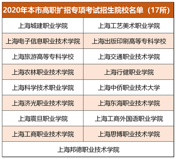 参加2020年本市高职扩招专项考试招生的院校包括上海城建职业学院、上海工艺美术职业学院、上海电子信息职业技术学院、上海出版印刷高等专科学校、上海旅游高等专科学校、上海交通职业技术学院、上海农林职业技术学院、上海行健职业学院、上海科学技术职业学院、上海中侨职业技术大学、上海济光职业技术学院、上海东海职业技术学院、上海震旦职业学院、上海工商外国语职业学院、上海工商职业技术学院、上海思博职业技术学院、上海邦德职业技术学院等17所。招生专业主要为本市经济建设急需、社会民生领域紧缺和就业率高的专业,具体专业和计划安排详见上海招考热线公布的专业目录。