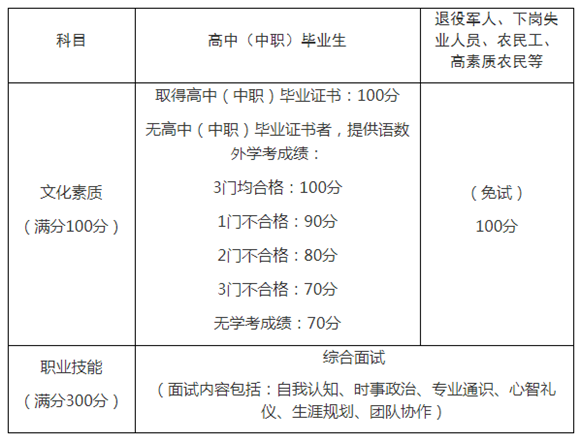 本次高职扩招专项考试采用“文化素质(满分100分)+职业技能(满分300分)”的考试形式,由各招生院校联合命题,共同组织实施,职业技能考试时间为10月11日。