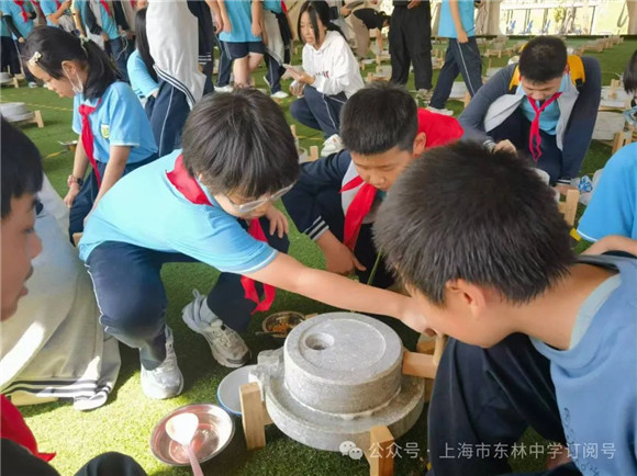 接着,同学们来到了传统石磨坊,导游先向同学们介绍了豆浆的历史和制作流程,介绍结束后,同学们分小组开始动手实践,他们将浸泡好的黄豆放在石磨上,然后用力推动石磨,让黄豆在磨盘中慢慢磨碎,释放出豆浆,清澈的豆浆从磨盘中缓缓流出,同学们的脸上都洋溢起来满足的笑容。
