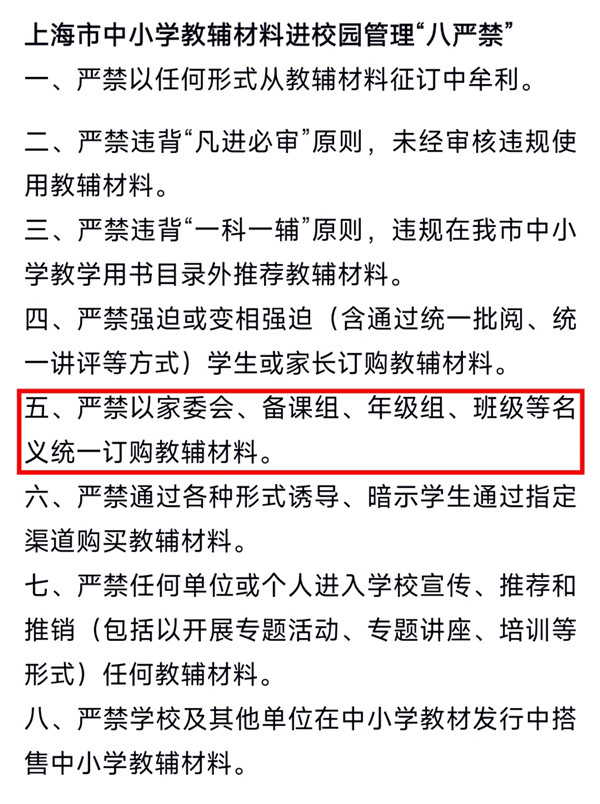 为进一步规范学校教辅材料选用和使用行为,连日来,本市各校相继通过校园网、学校官微等发布《上海市中小学教辅材料进校园管理“八严禁”》,其中特别提出严禁以家长委员会的名义统一订购教辅材料。近年来,家委会该做什么、不该做什么,始终边界理不清,由此也引发了必须为家委会工作设立“负面清单”的呼声。