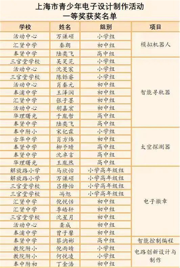 近日,2024年上海市青少年电子设计与制作活动圆满落幕。奉贤区代表队在多个项目斩获佳绩,荣获一等奖30个、二等奖31个、三等奖79个,赛事总成绩位列全市前列。奉贤中学徐春凤等12名教师获评优秀指导教师,奉贤中学、华理曙光、汇贤中学、奉中附初、三官堂学校、解放路小学获评优秀组织学校,奉贤区青少年活动中心获评优秀组织奖。