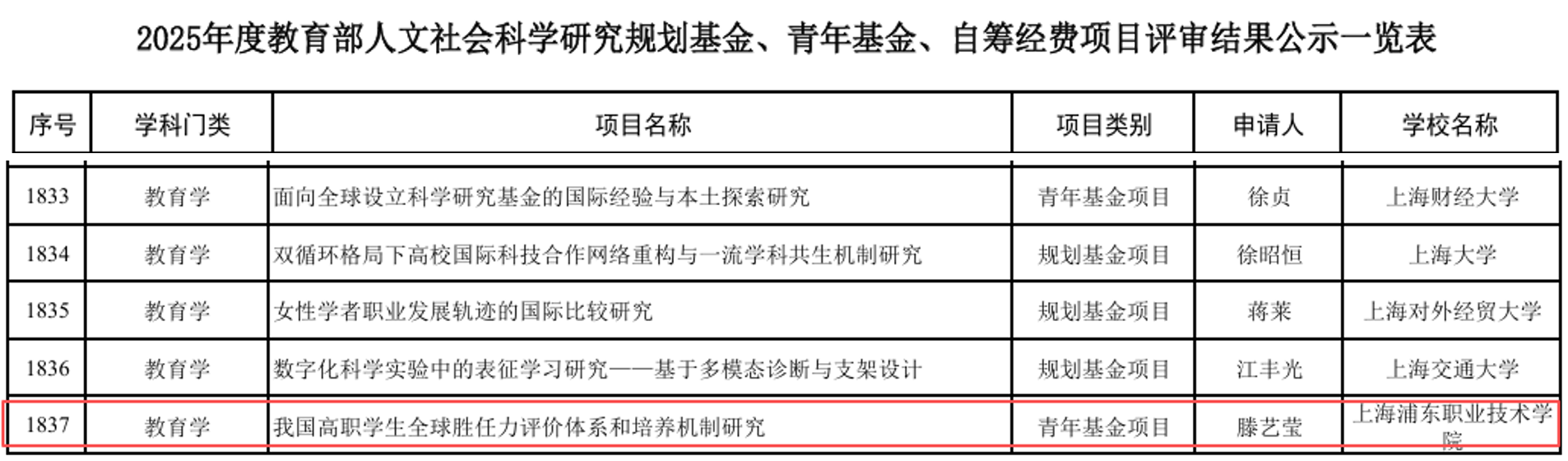近日,2025年度教育部人文社会科学研究一般项目评审结果由教育部社科司公示,上海浦东职业技术学院滕艺莹老师申报的课题《我国高职学生全球胜任力评价体系和培养机制研究》获批青年基金项目。