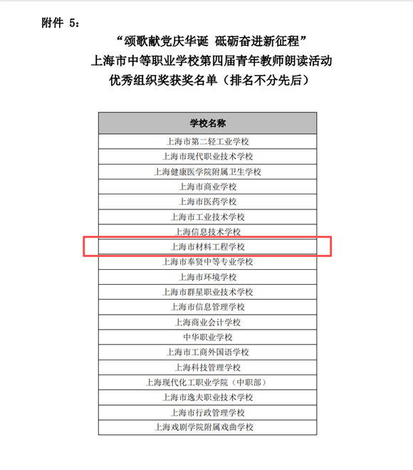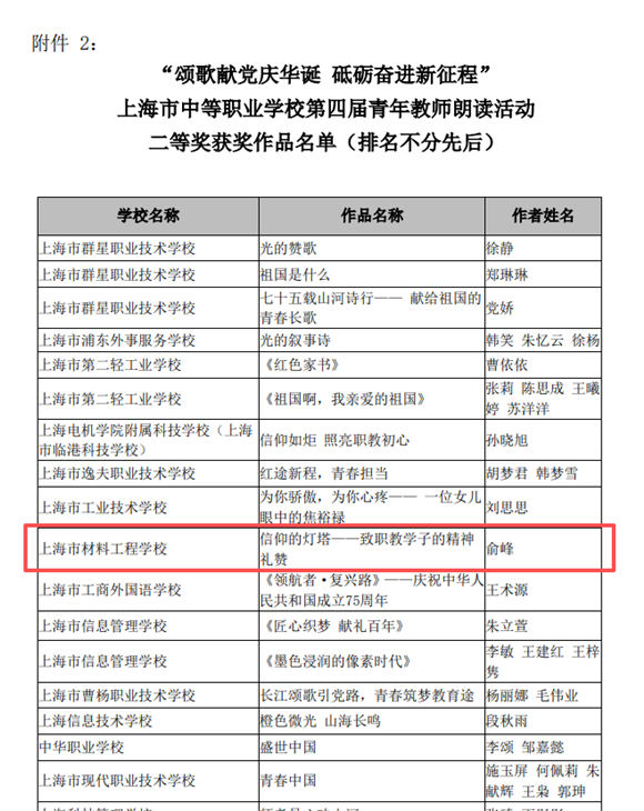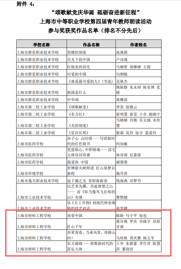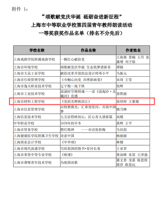 "颂歌献党庆华诞 砥砺奋进新征程"上海市中等职业学校第四届青年教师朗读活动获奖名单日前公布,上海市材料工程学校6支青年教师队伍斩获多个奖项,其中姜绍帅、王紫璇组荣获一等奖,俞峰组荣获二等奖,其余队伍荣获参与奖,学校荣获优秀组织奖,收获满满。