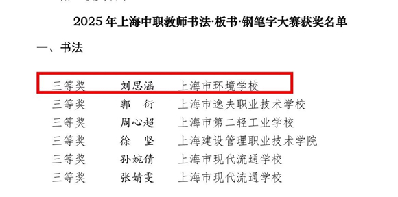 10月26日,由中国教育工会上海市中职校工作联合委员会主办的2025年上海市中职校教师书法·板书·钢笔字大赛暨第十届上海市教师书法·板书·钢笔字大赛选拔赛在上海市工商外国语学校顺利举行。上海市环境学校刘思涵、李倩、邱丽扬和王锦瑞四位老师代表学校参赛,并斩获多项荣誉。学校工会荣获大赛"优秀组织奖"。