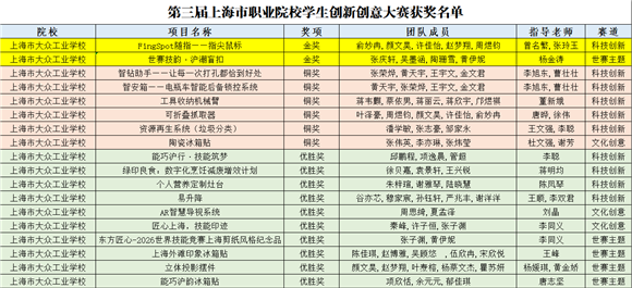 近日,第三届上海市职业院校学生创新创意大赛获奖名单正式公布。在这场全市职业院校同台竞技的比赛中,上海市大众工业学校学生凭借扎实的专业素养与突出的创新能力,从全市66所院校1141个参赛项目中脱颖而出,一举斩获2项金奖、6项铜奖、10项优胜奖,总计18项荣誉,充分彰显了学校创新创业教育的丰硕成果。