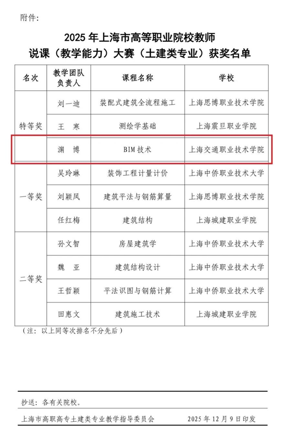 在2025年上海市高等职业院校教师说课(教学能力)大赛(土建类专业)中,渊博老师主讲的《BIM技术》课程获特等奖。该课程以职业岗位能力为导向,教学设计数字化特色鲜明,教学逻辑清晰、课堂组织高效,在众多参赛作品中脱颖而出,体现了学校在教师教学能力培养与课程数字化建设方面的扎实成效。
